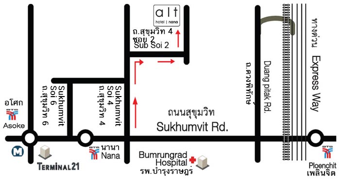 | Located in the never-sleep Soi Nana (Sukhumvit Soi 4), alt hotel brings you closest to all the actions Sukhumvit and Bangkok have to offer. Yet it is tucked away in Sub Soi 2, a more residential area making your stay quiet, private, and peaceful. A complimentary eco-friendly golf car is running on frequent schedule to bring you to Sukhumvit Rd. and BTS Nana in a few minutes.