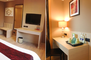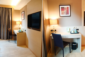 Deluxe Rooms with choice of one king-sized bed or two single beds. Safe, amenities, Cable TV and free Wi-Fi. |