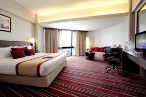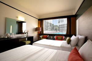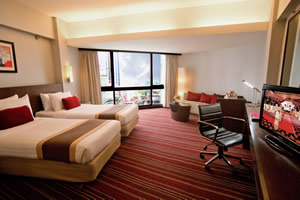 Spacious room with panoramic city skyline view, available with either king or two single beds.