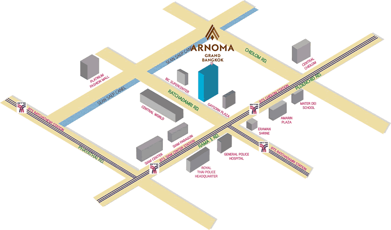 Arnoma Grand Bangkok is also across the road from Centralworld’s 400 Shops and Restaurants,