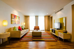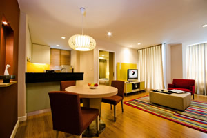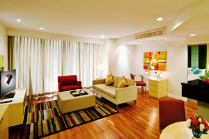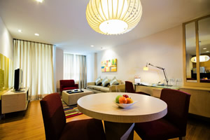 décor with urbane comforts. Every room features at least one bathroom, while many room types also include a spacious living area, work desk, kitchen, dining area, and balcony—many of which afford stunning views of Lumpini Park and downtown Bangkok.