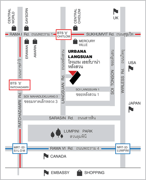 Urbana Langsuan Bangkok is strategically located right in the heart of Bangkok'sCentral Business District. Embassies and prime shopping centres like Central Chidlom Department Store, Gaysorn Plaza and Central World Plaza are close by. Great entertainment and dining outlets are a stone's throw away, and the Chidlom and Ratchadamri. BTS Skytrain stations are within walking distance. With the largest public park nearby, the Lumpini Park accords residents the calming presence of nature. For the perfect combination of city living, tranquility and privacy, it has to be Urbana Langsuan The Bangkok International Airport is an hour's drive away. |