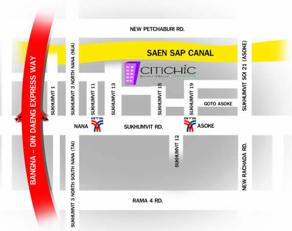 | The CITICHIC Sukhumvit13 by Compass Hospitality enjoys a convenient central location, close to The Queen Sirikit National Convention Centre, major embassies, banks, shopping and entertainment districts. There is easy access from Sukhumvit and Rama IV roads and onto the elevated highway (toll) network, with the new Suvarnabhumi international and domestic airport being approximately 40-60 minutes away by taxi, or hotel limousine. Within walking distance is a station on the ultra-modern Bangkok Mass Transit System (BTS Sky train), which is linked to the Mass Rapid Transit (MRT Underground) system. Together these provide fast, traffic-beating transportation to key districts around the city for business, sightseeing, shopping and entertainment. |