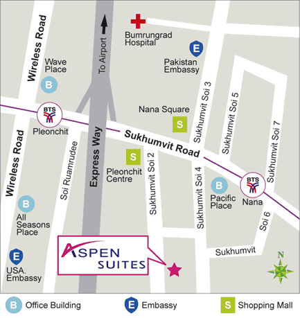 | Aspen Suites Hotel Sukhumvit 2 Bangkok by Compass Hospitality is approximately 40 minutes by car from Suvarnabhumi International Airport and the Don Mueang Domestic Airport can be reached in 30 minutes. A chauffeur driven limousine can be arranged on request, alternatively both taxi and airport bus services are readily available. |