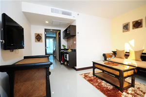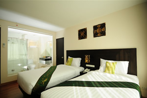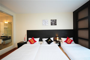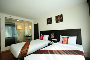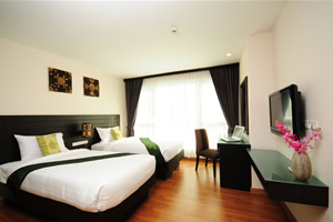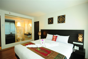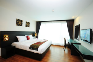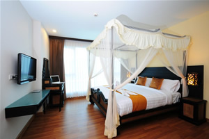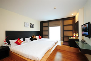 our rooms that makes a cozy, relaxing retreat for our guests. All our rooms are well-appointed and fitted with King sized or Twin premium quality beds and linens to ensure a restful night's sleep and modern amenities such as wall mounted LCD flat screen TV, DVD player, writing desk, wireless internet access, in-room safe and coffee/tea making facilities. Bathrooms feature glass enclosed shower unit with massage shower panels and hair dryers. Also, be charmed by our selection of differently styled rooms, each featuring a touch of the unique Thai, Chinese and Japanese decor, just to make life a little more interesting. And we are also proud to offer our suites, larger rooms configured to include an additional comfortable living space to relax and unwind from the overload of everyday life.
